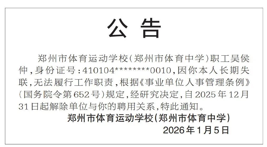 郑州市体育运动学校(郑州市体育中学)职工吴侯仲,身份证号:410104********0010,因你本人长期失联,无法履行工作职责,根据《事业单位人事管理条例》(国务院令第652号)规定,经研究决定,自2025年12月31日起解除单位与你的聘用关系,特此通知。